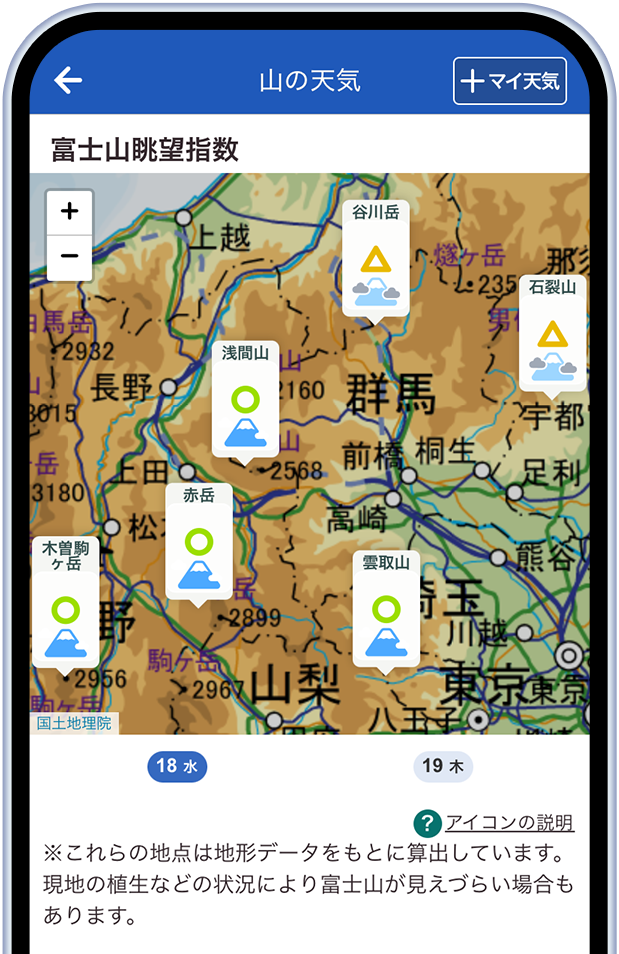 「山の天気」ではこれまで、山頂の霧予報を通じて登山の安全判断の指標および眺望の目安を提供してきましたが、今回は登山者にとっての楽しみの一つである“眺望”に特化し、「富士山が見えるか」に着目した専用の指数を開発しました。山頂から富士山を望める全国の山々を対象に、山頂と富士山のピンポイント天気、さらには両地点間の気象条件を解析し、4段階で眺望の期待度を予測します。「今日は富士山が見えるかな?」という期待に気象データに基づく予測でお応えし、より豊かな登山体験の実現をサポートします。