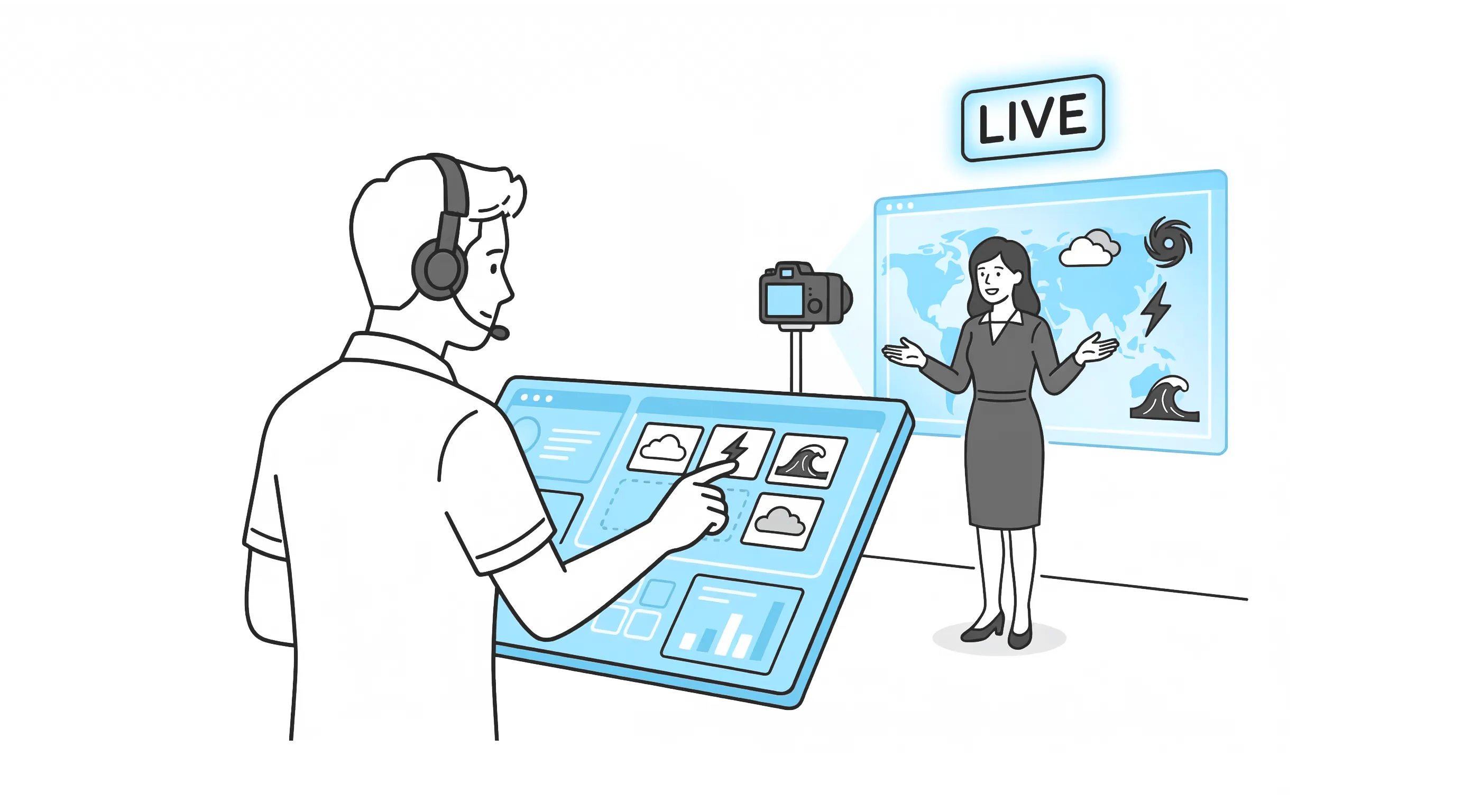 「ウェザーニュースLiVE」を通じて、気象予報を速く、正しく、そして視聴者の心に届く形で表現します。 運営スタッフは、刻一刻と変化する気象データや視聴者からのリアルタイムリポートを瞬時に読み解き、今伝えるべき情報の優先順位を判断する「現場の司令塔」です。一方でキャスターは、専門的な気象解説を日々の生活に寄り添った言葉へと翻訳し、双方向のコミュニケーションを通じて視聴者と共に番組を作り上げていきます。